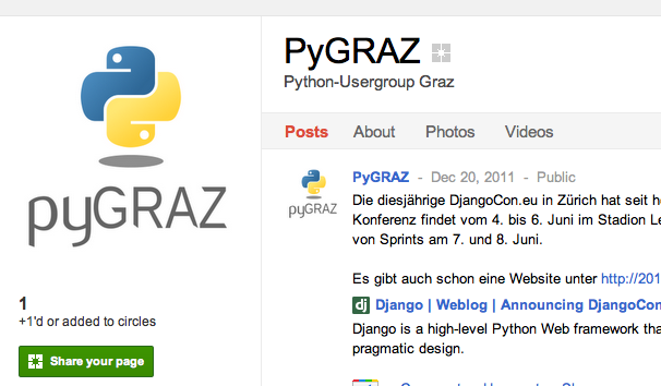 Back then I immediately created a brand page for our local Python usergroup in Graz which I by now use over Twitter for sharing news and informations with the community. And since mid-December we can also finally have more than one account with write and management access to it :D Right now I’m still the only manager of that page but I hope this will change with our first virtual meetup next week :D I’m personally really curious how the hangouts feature of Google+ will work out for something like a community meetup. There are some rumors that Google is working on allowing more than 10 people to join a hangout as visitors but sadly this didn’t made it live in time.